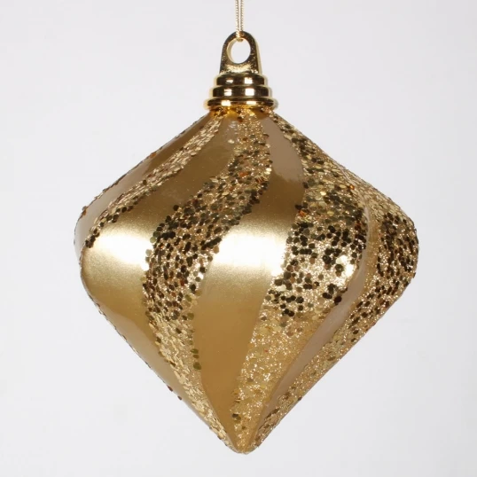 6 inch Candy Glitter Swirl Christmas Diamond Ornament: Gold. Create a custom Christmas tree design with the addition of these stunning diamond-shaped glittered ornaments. The candy shine and glitter finish reflects light, adding depth and dimension to any sized tree. Purchase your favorite combination of colors to update your tree or tie them to the ribbons on a present and give them as a gift.