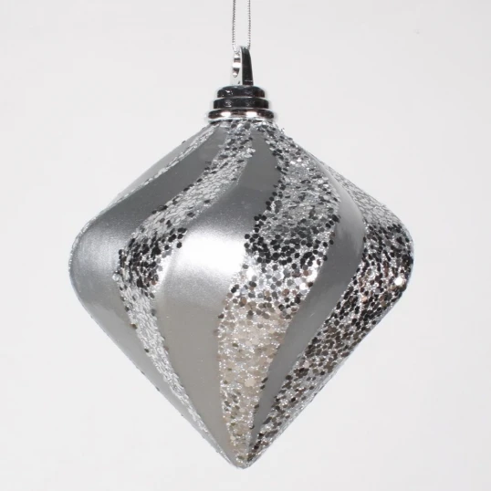 6 inch Candy Glitter Swirl Christmas Diamond Ornament: Silver. Create a custom Christmas tree design with the addition of these stunning diamond-shaped glittered ornaments. The candy shine and glitter finish reflects light, adding depth and dimension to any sized tree. Purchase your favorite combination of colors to update your tree or tie them to the ribbons on a present and give them as a gift.