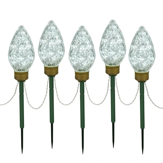 8.5 inch C9 LED Light Stakes with 100 Cool White LEDs. Here’s an unusual spin on Christmas lights for you: LED Light Stakes for the front lawn! Drive these Christmas bulbs into the ground to illuminate the walkway for your holiday guests. Choose from multicolored and cool white lights. Includes 100 lights.